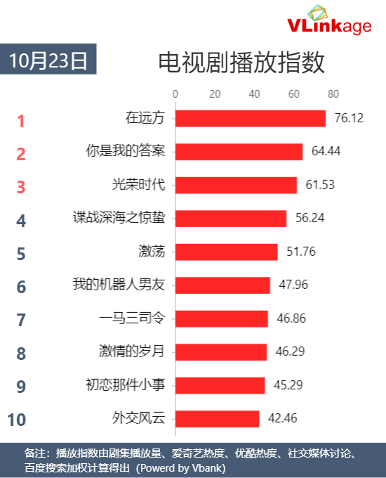 【纬岭榜单】10月23日当日#电视剧播放指数#:1.#在远方#播放指数 76.12 2.#你是我的答案#3.#光荣时代#4.#谍战深海之惊蛰#5.#激荡#6.#我的机器人男友#7.#一马三司令#8.#激情的岁月#9.#初恋那件小事#10.#外交风云#