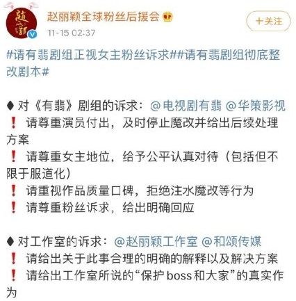 最近,赵丽颖深夜发文分享“原著改编图”,疑似是内涵有翡剧组。早在赵丽颖疑似内涵有翡剧组前,赵丽颖的粉丝就曾发文怒批有翡剧组,历数其种种不是,如停止魔改,尊重女主地位等等。