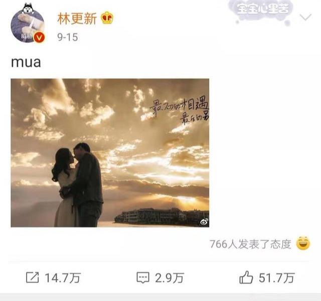 两人似乎就是因为合作新剧相识擦出爱火,之后微博也是各种互动频频,比如林更新在9月曾发了一张两人亲吻的剧照,配文相当暧昧“mua”。
