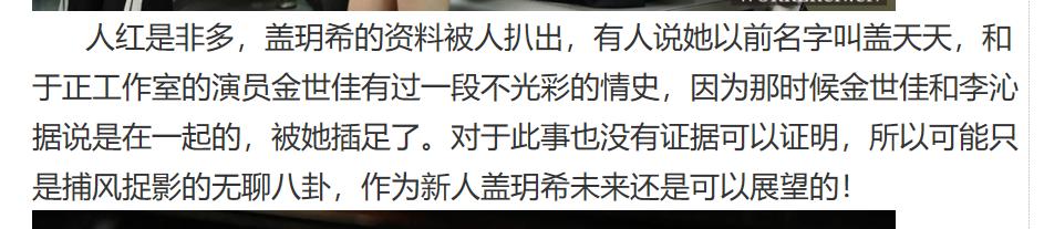外传盖玥希曾叫盖天天,和金世佳传过绯闻。不过当事人没有回应,也就无从考证真假。可以看出,盖玥希出道虽然有些年头,但是在娱乐圈一直都比较没什么热度,今年跟林更新合作了新剧,才正式有了一些知名度。