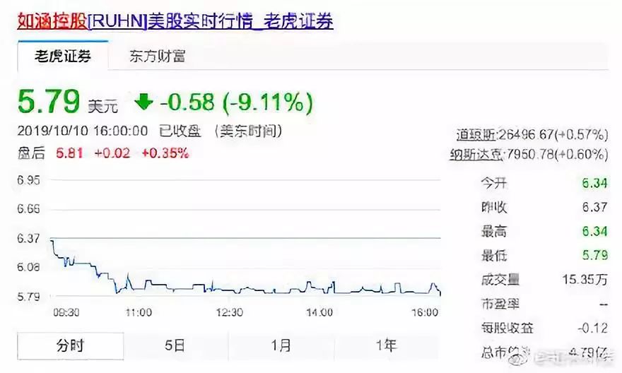 今年4月3日,如涵控股登陆纳斯达克交易所,上市首日即大跌37%。截止10月10日收盘,如涵控股市值较上市首日缩水过半。