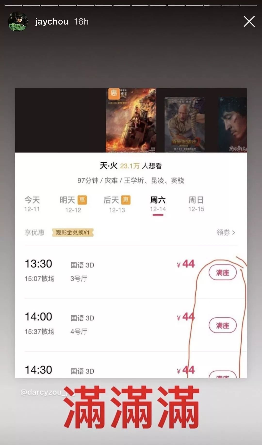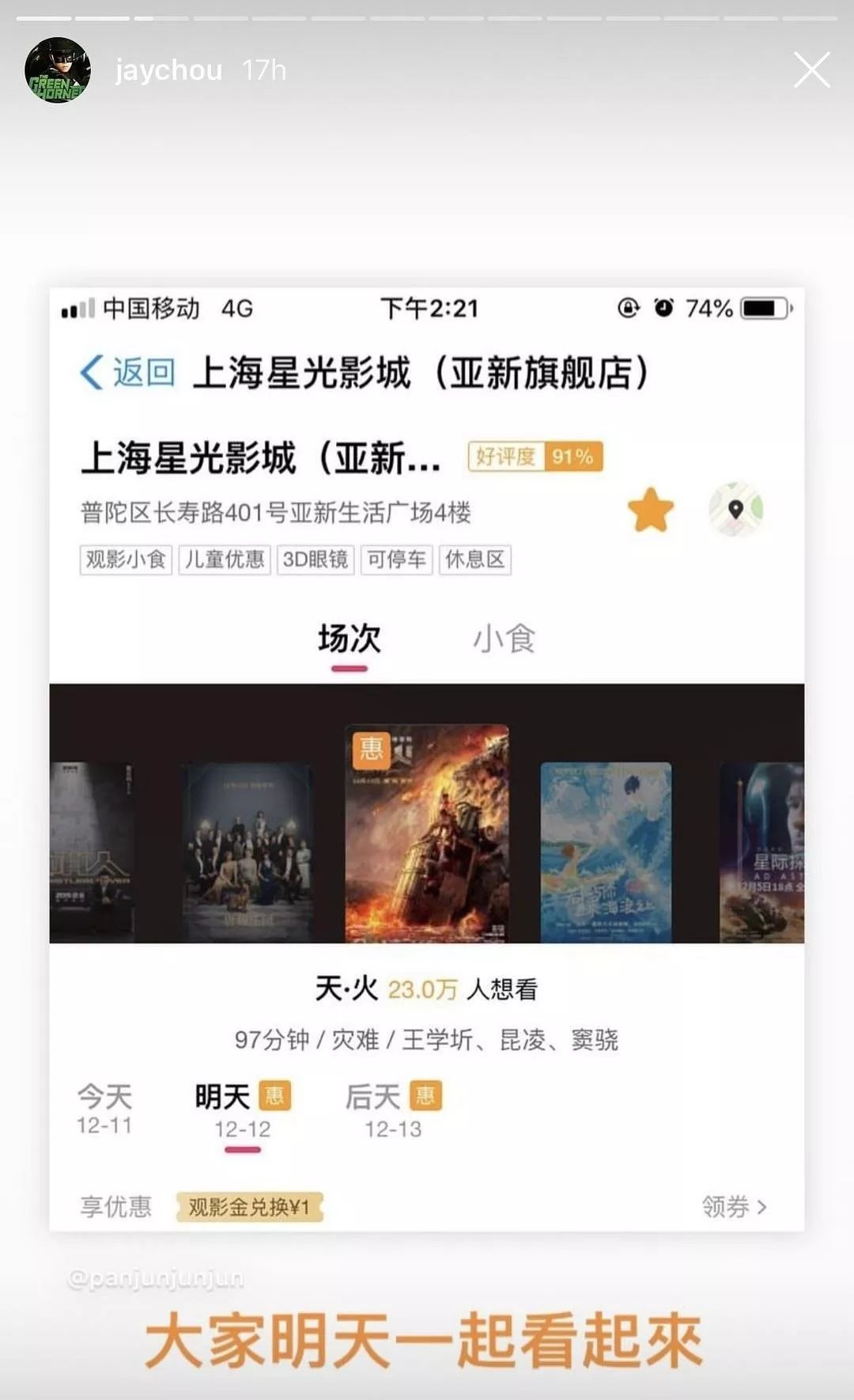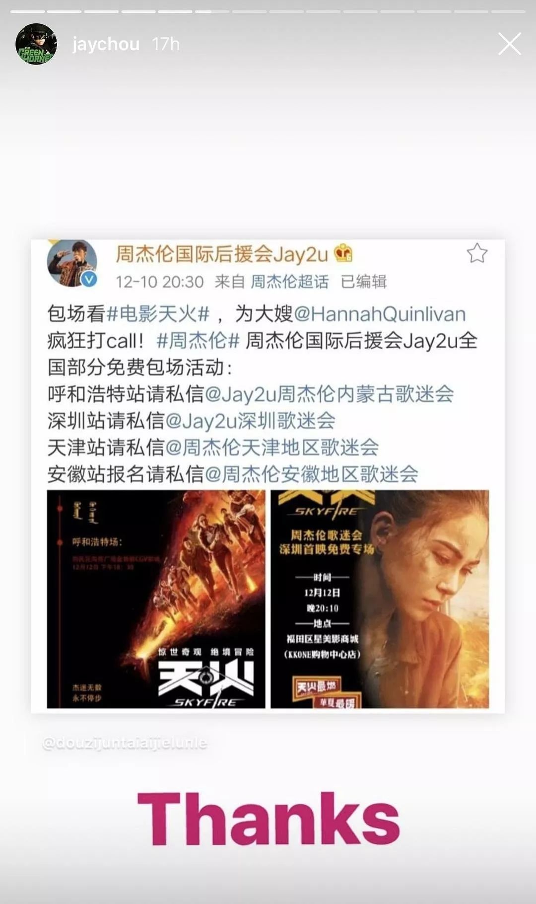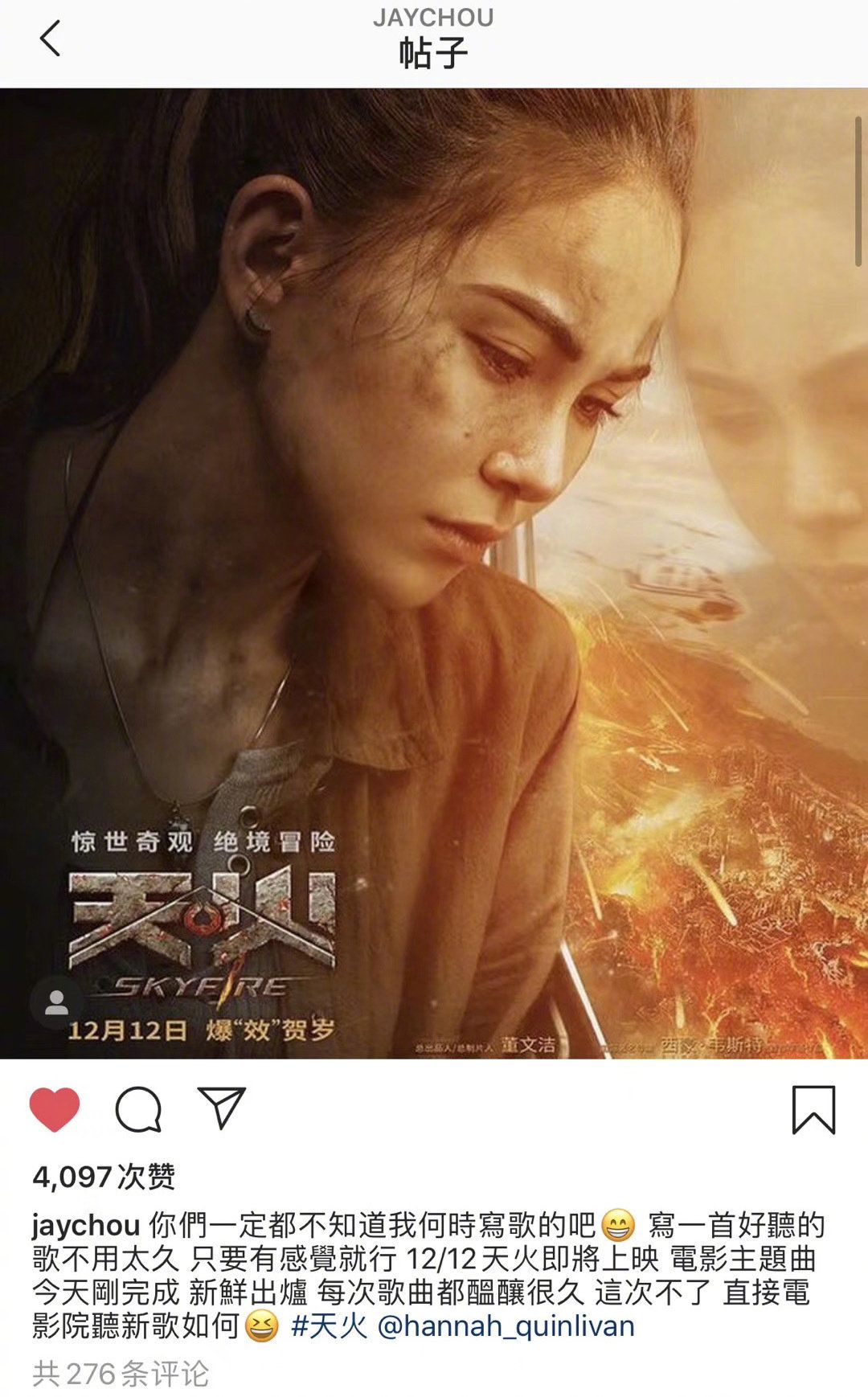 杰伦不仅ins频繁为《天火》做宣传。