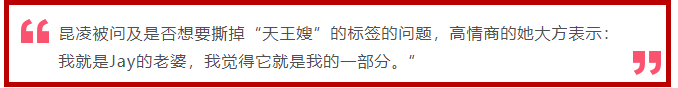 她说“天王嫂”这个标签其实就是她的一部分,她是昆凌,同时也是Jay的老婆。