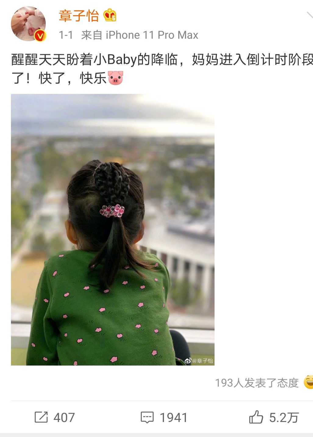 其实在1月1号的时候章子怡就在微博上发了女儿醒醒的背景照并配文“醒醒天天盼着小baby的降临,妈妈进入倒计时阶段了!快了,快乐。”没想到真的这么快,当天就顺利产子。章子怡今年已经40岁了,算是大龄产妇,据汪峰微博透露章子怡这次还是顺产,孩子还有七斤二两,是真的很不容易了,不过也正如夫妇二人所愿是个儿子,章子怡如愿以偿实现儿女双全的愿望,汪峰也终于摆脱了岳父命。