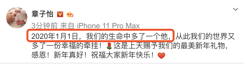 2020年1月3日,章子怡在社交平台官宣生下二胎,大家纷纷送上了祝福。