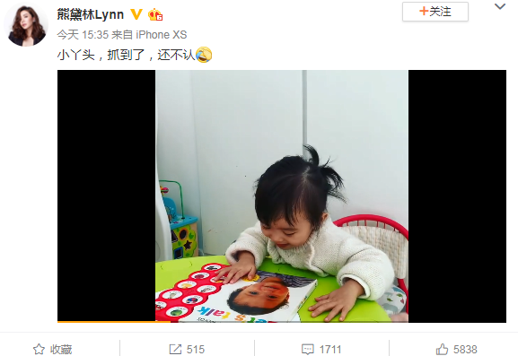 最近,熊黛林又拍了一段短视频,在这个视频中熊黛林的女儿对某杂志封面上的小男孩做亲嘴状,被熊黛林给拍了下来。熊黛林在抓到女儿“现行”后问自己的女儿,哥哥帅不帅,结果小女儿一会说帅一会又说不帅,非常可爱。