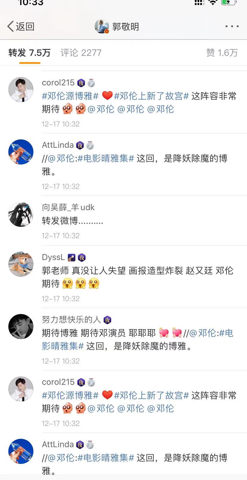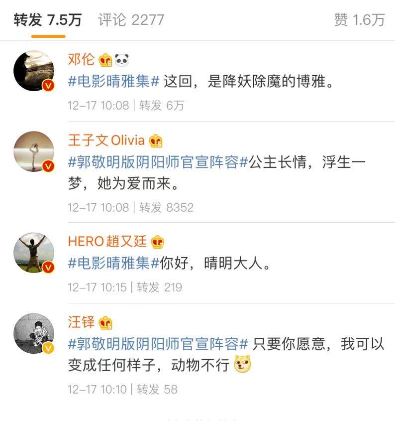 赵又廷、邓伦、王子文和汪铎都转发了郭敬明的官宣微博,分别证明自己出演的角色。