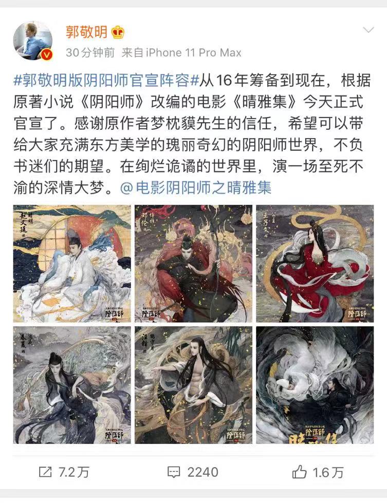 郭敬明根据日本作家梦枕貘的小说《阴阳师》改编成两部电影,第一部叫《晴雅集》,另一部叫《泷夜曲》,郭敬明声称已经筹备了三年,看来终于要开机了,主演阵容都已经官宣。