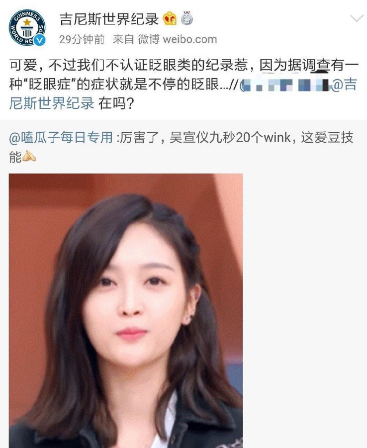 吴宣仪在节目里还给大家带来了一段wink秀,据统计9秒眨了20次。呆呆看了都被萌一脸,结果又被黑粉借此喷了下,还故意@了吉尼斯官微。