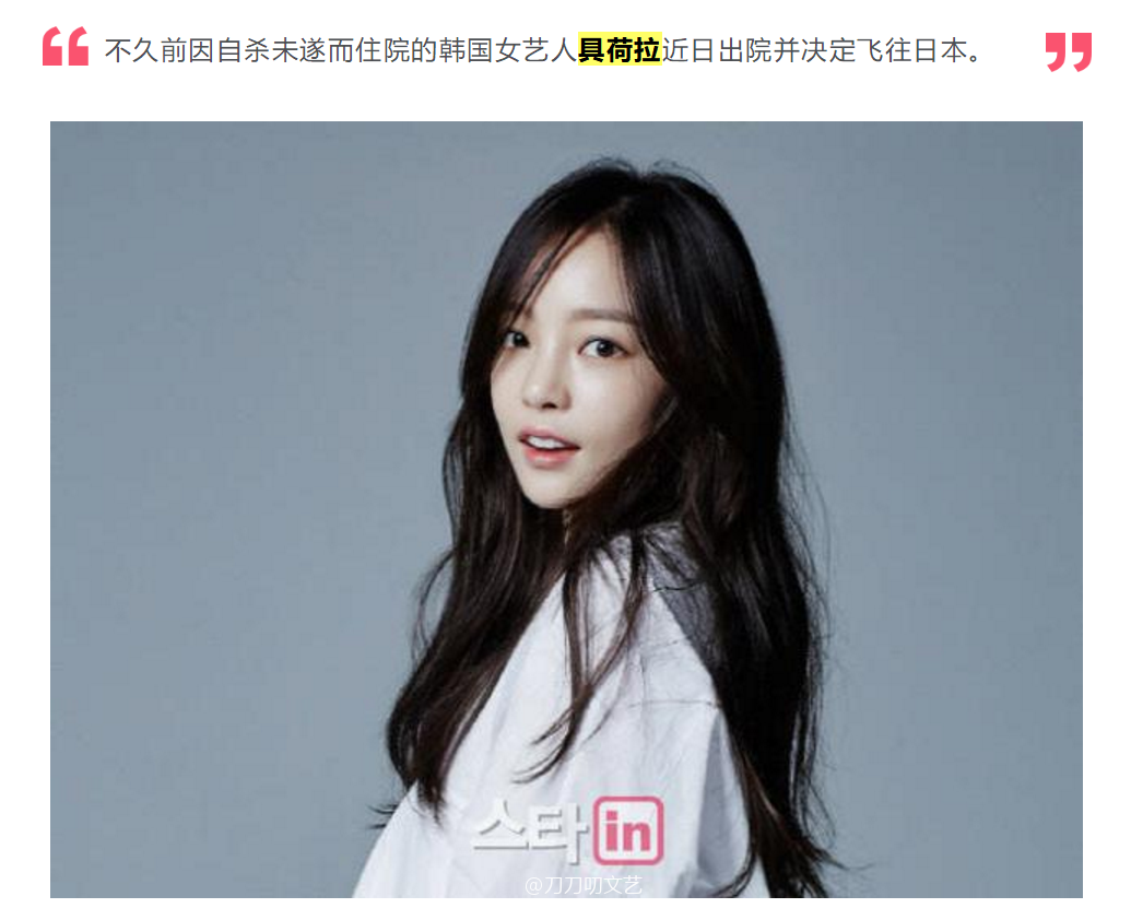 雪莉去世后,韩国呼吁针对网络恶评的“雪莉法”还没有成真,雪莉的好友具荷拉就已经追随雪莉脚步离去,又一个鲜活的生命被韩国娱乐圈这个名利场巨兽所吞噬。