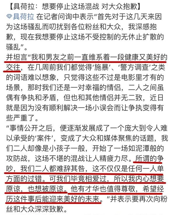 具荷拉,起初对渣男还抱有好合好散的想法,说自己并不愿意将事情扩大,虽然男方威胁说“要毁了你的演艺前途”,但具荷拉说:“他有才华也值得尊敬,希望经历这件事情后能迎来美好的未来。”