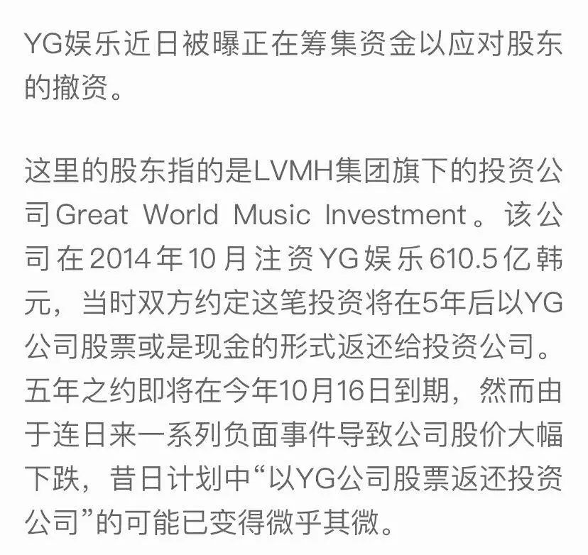 而作为昔日韩国娱乐公司三大巨头之一的YG娱乐公司,现在倒更像个拖后腿的孩子,在拥有像BIGBANG、BLACKPINK、鸟叔、刘仁娜等丰富艺人资源的情况下,仍然面临着巨额债务要偿还的情况。据了解,YG公司正准备向lVMH公司偿还高达670亿韩元的投资金。