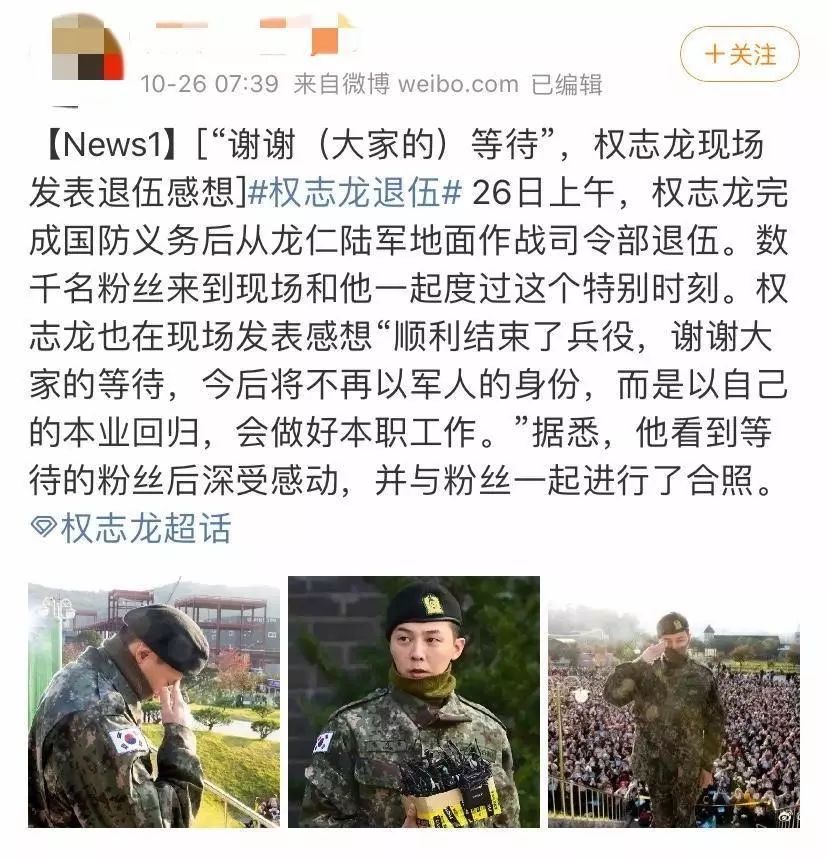 今天,权志龙正式退伍,等待了两年之久的VIP们终于迎来花期,见到了自己最爱的偶像。GD两年兵役“封印”解除,可谓是王者归来!在现场,数千名粉丝陪权志龙度过了这个难忘的特别时刻,他和现场粉丝互动,发表退伍感言,表示顺利结束兵役,谢谢大家的等待,今后会以本业回归,做好自己的本职工作。