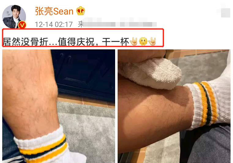 不过张亮的心情并未因受伤而受到影响,他配文中写着:“居然没骨折,值得庆幸,干一杯”。不得不说他的心态很好了,没有喊痛没有诉苦,反而自我安慰一番。