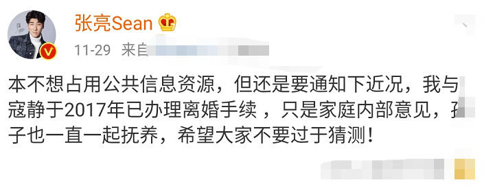 然而,张亮的好口碑却因两个原因严重受损,他以往的好男人形象也崩塌。其中一个原因就是离婚一事。11月29日,张亮突然官宣与妻子寇静离婚,当时引起了全网热议,强势霸占头条。