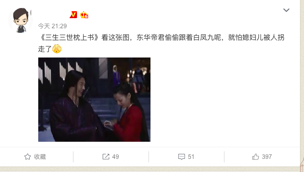 经连宋真相后,发现帝君根本就是个易燃易爆炸的陈年醋坛。在爱情上是个傻子,吃起醋来想杀人。果不其然,在后续的剧情当中,但凡是一个异性和凤九相处,帝君都要酸出天际。帝君除了要提防叶青缇、沧夷神君和苏陌叶这几号劲敌之外,发起狠来连自己爱尚影视的醋都吃。
