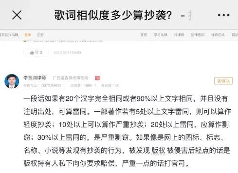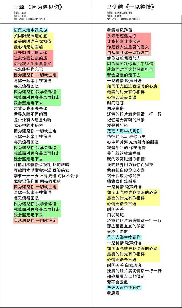 有专业律师曾经在网上科普“歌词相似度多少算抄袭”,“一部著作若有5处以上文字雷同,则可以算作轻度抄袭;10处以上可以算作严重抄袭;20处以上雷同,应该算作剽窃;30%以上雷同的,是严重剽窃。”马剑越这首歌曲算是什么程度的雷同,大家也是有目共睹了。
