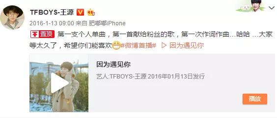 王源是大家都非常熟悉的一位年轻偶像,多才多艺,在14岁生日时专门创作了歌曲《因为遇见你》,作为礼物献给粉丝,这是他的第一首原创作品,对于王源本人和粉丝来说,都是意义重大。王源微博至今还将这首歌置顶,可见对其尤为重视。