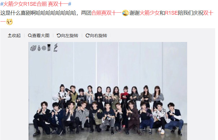 不过要说哪组合照最映双十一的景,那肯定是我们的女团火箭少女101和男团RISE,为什么这么说呢,因为众所周知,这两个团团员都是11个人,他们在后台也是首次大合影,网友们纷纷笑称,真正的“双十一”。