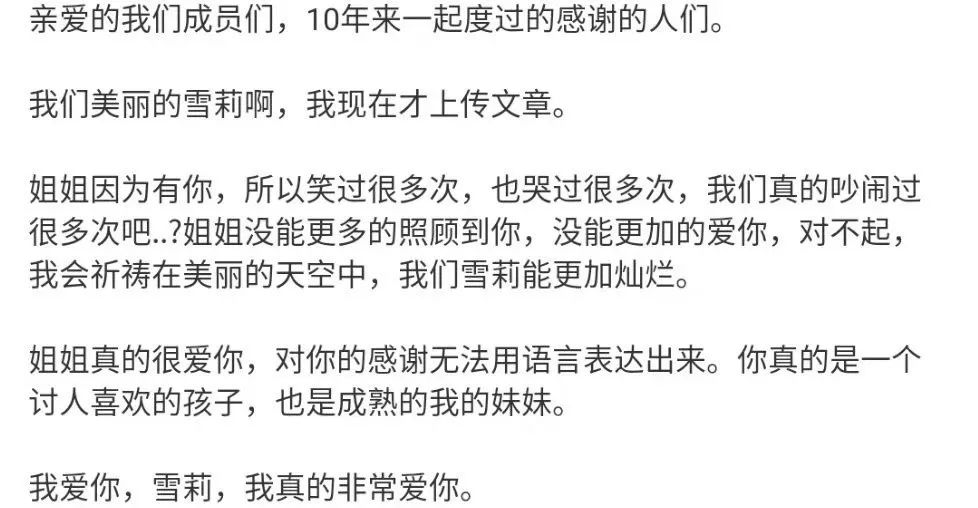 Luna表示,她因为有雪莉,笑过很多次,同时也哭过很多次,她还直言:“我们真的吵闹过很多次吧?”接着,Luna有点歉意的说道:“姐姐没能更多的照顾到你,没能更加的爱你,对不起,我会祈祷在美丽的天空中,我们的雪莉能更加灿烂。”最后,Luna表达了对雪莉的喜爱,称自己非常爱雪莉,她说雪莉是个很讨人喜欢的孩子。
