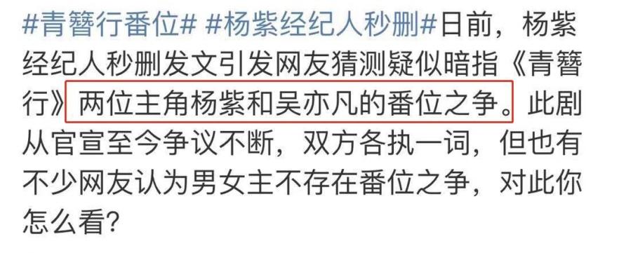 上周,电视剧《簪中录》改名《青簪行》后,官宣了杨紫和吴亦凡为主演,但却迟迟不肯明确番位,使得本就因此不满的粉丝更加质疑剧方,引发了两方大规模的争吵,甚至在杨紫吴亦凡经纪人发微博安抚后也未见平息。