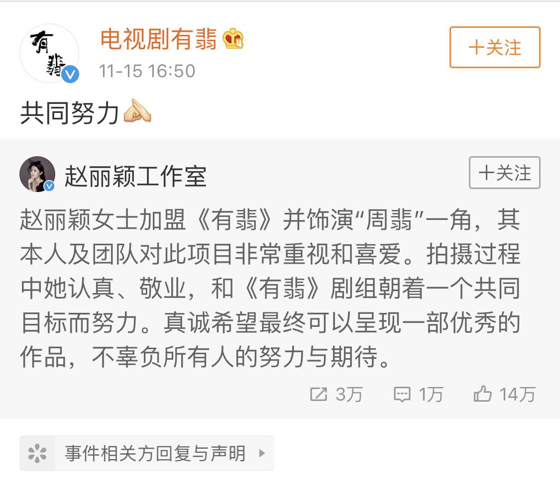 同样是在近期被曝出剧方与演员争端的还有赵丽颖和王一博主演的电视剧《有翡》。