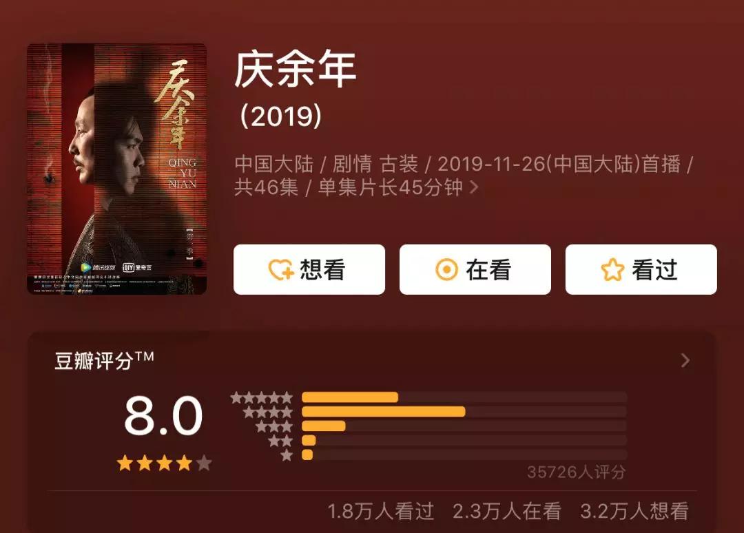 在腾讯和爱奇艺“零宣发”上线第三天,《庆余年》的豆瓣评分就从开画的7.8涨到了8.0,评分人数超2.5万,并开始连续盘据猫眼电视剧+网络剧以及网络剧全网热度榜两榜首位。