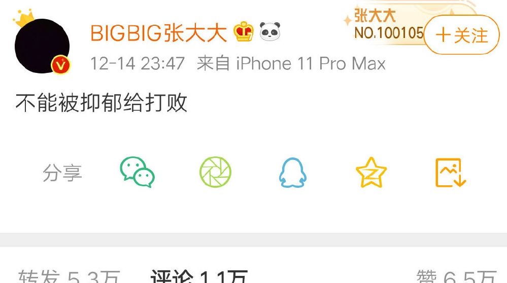 12月14号深夜零点,知名主持人张大大在社交平台发文:“不能被抑郁症给打败”,短短的几个字可见他此时情绪崩溃,难以入睡。细心的网友发现,他还换上了全黑的头像,这是在暗示自己心情低落。
