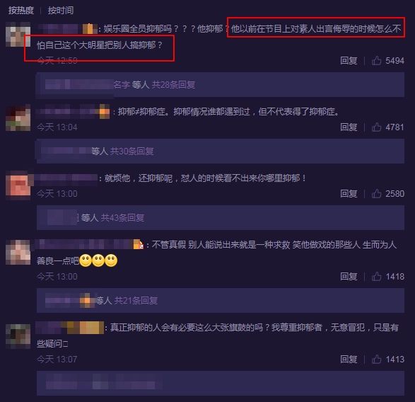有粉丝在底下留言:你一定要好好的,爱笑的大大,早日康复等你归来。但翻看评论区,一大批键盘侠diss他,说他戏精,患抑郁还要昭告天下,你节目上怼别人时咋不怕得抑郁呢?网友们言辞激烈,话语不堪入耳。
