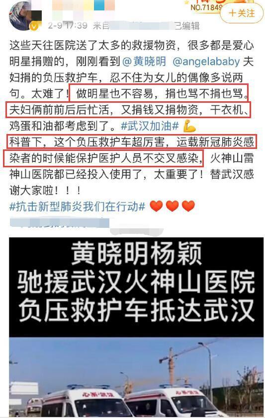 其实,说起来,黄晓明baby夫妇也是很不容易的,从20万被人骂,到追加80万善款,再到干衣机和鸡蛋食用油,现在又来捐救护车!