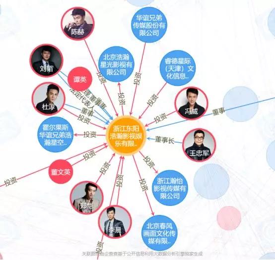 企查查显示,2015年10月,冯绍峰、李晨、陈赫、杜淳等人联合成立了浙江东阳浩瀚影视娱乐有限公司,仅成立一天后,华谊兄弟宣布以10.8亿元收购该公司70%的股权,溢价超过一百倍。