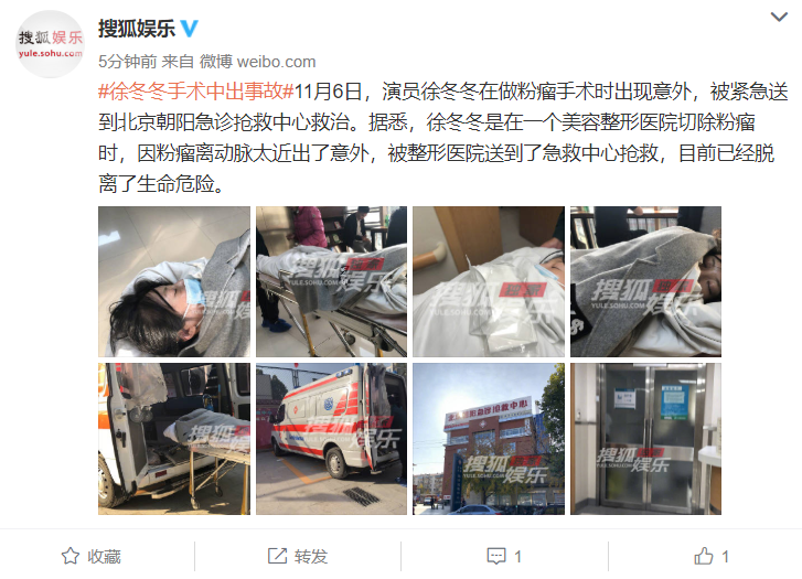 据媒体描述,徐冬冬当时是在一个美容整形医院切除粉瘤时,因粉瘤离动脉太近出了意外,随后,整形医院相关人士便连忙将其送到了急救中心抢救,目前已经脱离了生命危险。