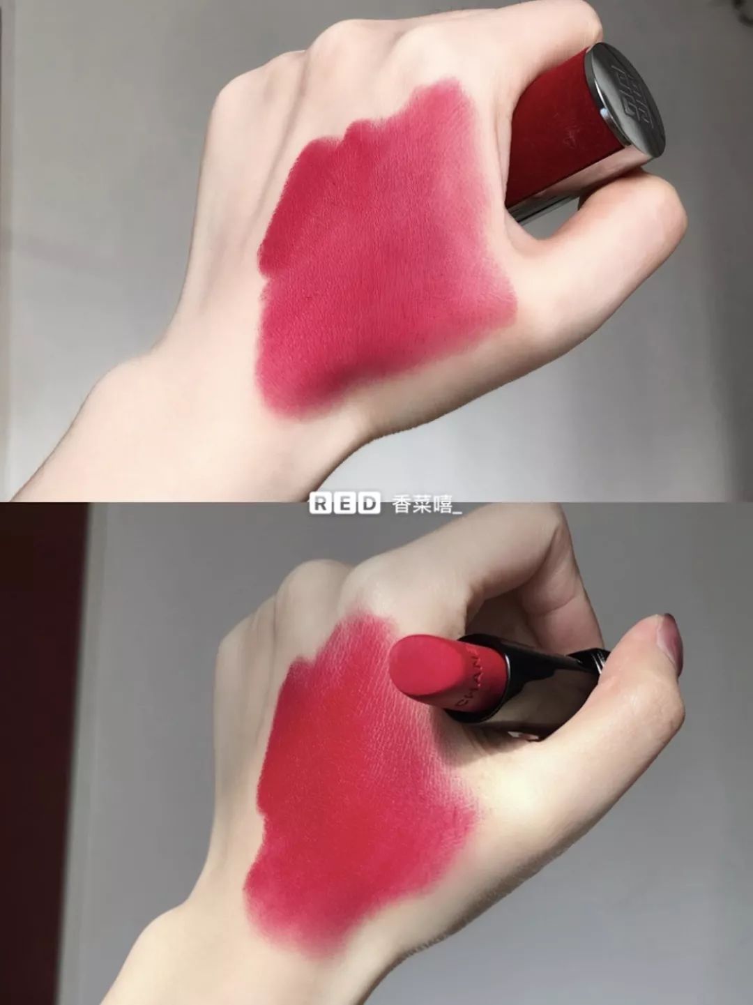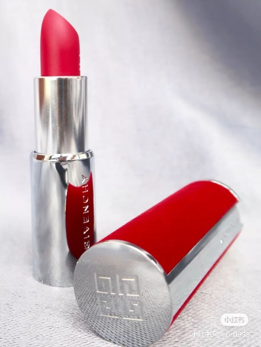 Givenchy这支从包装来看就是质感的代名词,大红色的外壳拿在手里就让我想给你们拜个早年,里面的口红也是雾面质地,真的高级惨了。