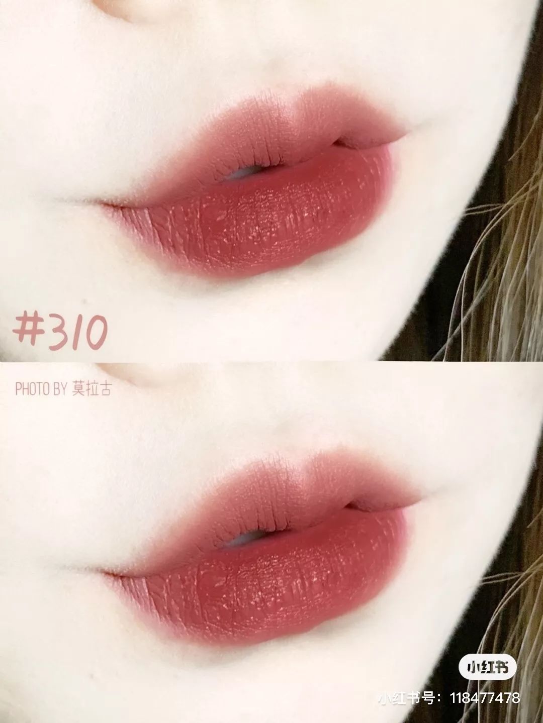 欧莱雅这支#310也是我的本命色,颜色是豆沙带点棕,自带气质buff,低调又高级,温柔还带点时髦,还贼显白,属于这个季节的必备单品。