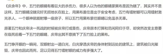 原著中的五竹是机器人,面瘫忠犬,武力值超高,日常用黑布蒙着双眼,据说是因为眼睛会发射光线,剧中似乎也延续了这一设定,因此呈现出的便是沉默寡言又呆萌可爱的五竹啦。