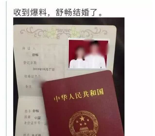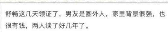 早在2018年舒畅就曾被爆出过结婚的消息,然而许多网友质疑结婚照是修的图,但有网友爆料舒畅早已有了恋情,是某个企业 老总的独子,当事人却没有回应。此次被曝出恋情,不知道当事人会不会给粉丝一个答案呢?期待舒畅能够一直幸福啊。