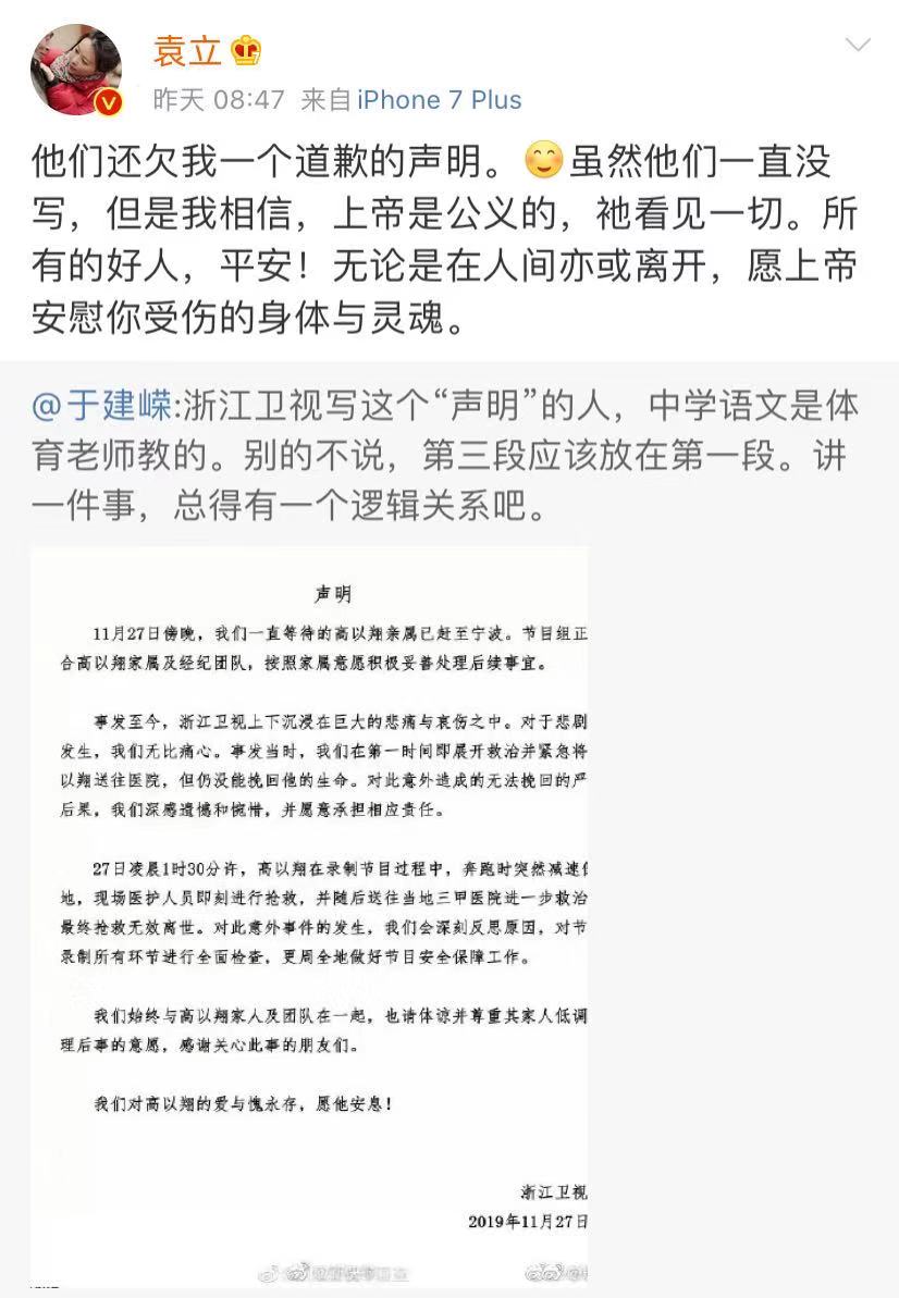 袁立曾参加《演员的诞生》因为节目剪辑的效果引发很多热议,导致袁立狠狠的撕掉蓝台的遮羞布,最终获得80多万酬劳,捐给给自己的慈善机构,用于尘肺病人的治疗,这事已经过去三年,还是被津津乐道,与高以翔一起参加节目录制的嘉宾陈伟霆、黄景瑜、吴宣仪等人都没有在微博发布与高以翔有关的动态,不知道是什么原因。