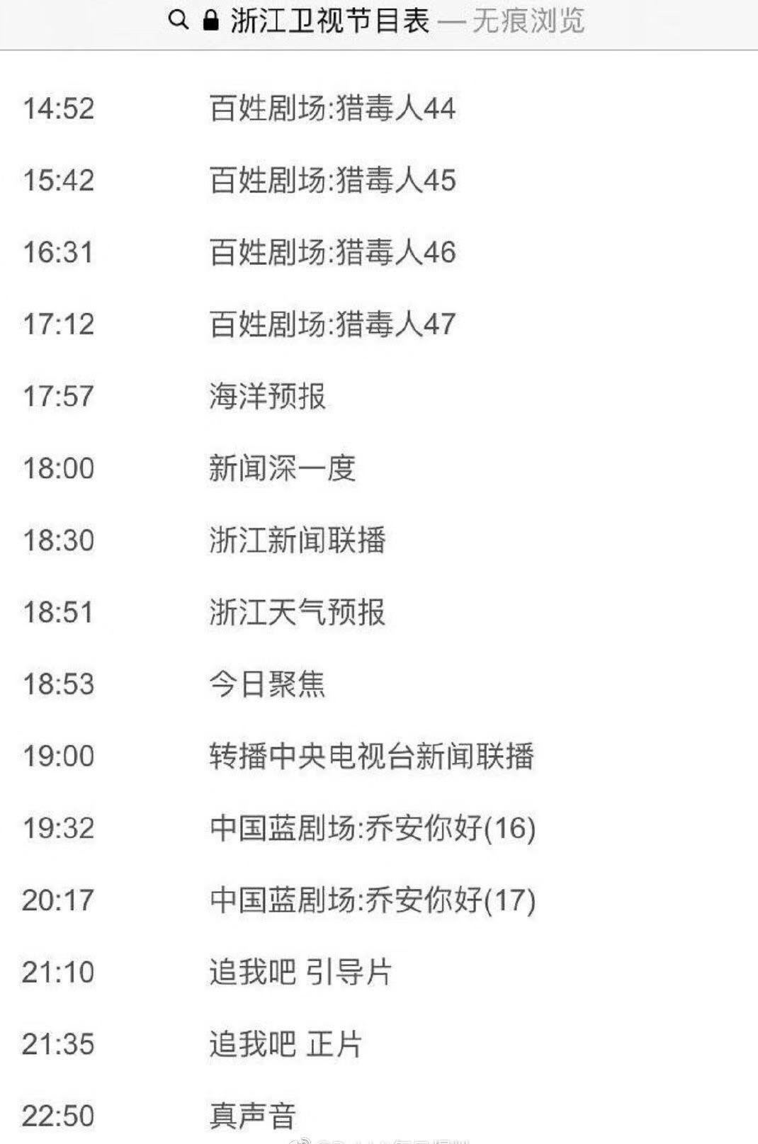 浙江卫视今天播出的节目预告,貌似《追我吧》并没有停播,看来并没有受到高以翔的猝死事件影响,而且节目组和电视台已经声明,高以翔发生事故的瞬间,节目组工作人员和艺人经纪团队一直陪在现场,并没有离开,所以他们也尽力了,艺人最终是心源性猝死。