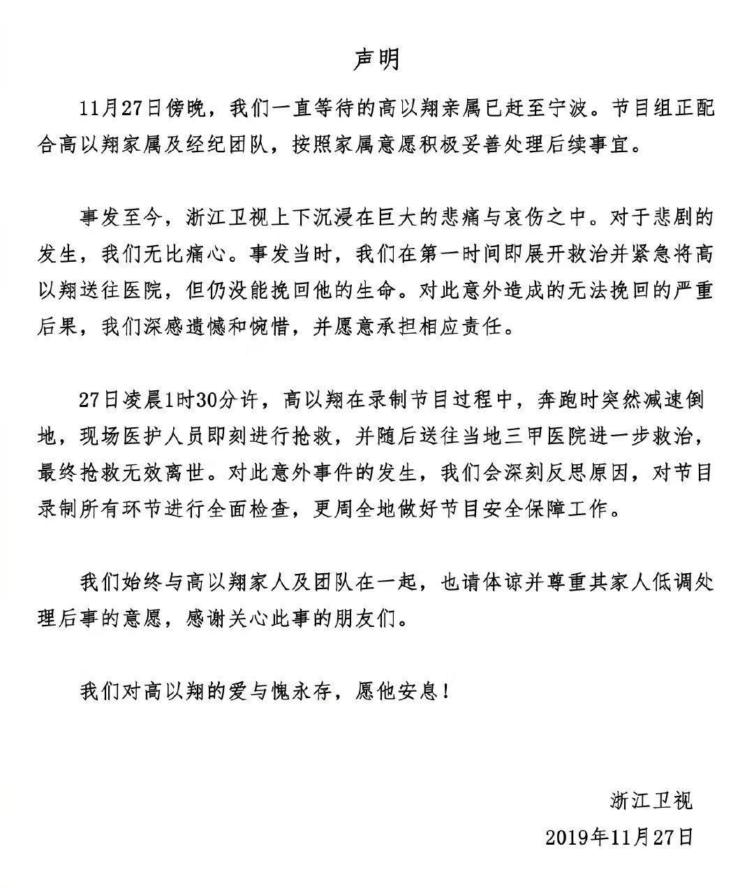 事故发生以后,先是节目组进行声明,到了网上蓝台才出现声明,对意外事件发生,我们会深刻反思原因,对节目录制所有环节进行全面检查,更周全地做好安全保障工作。深表遗憾和惋惜,也承诺会承担相信的责任。