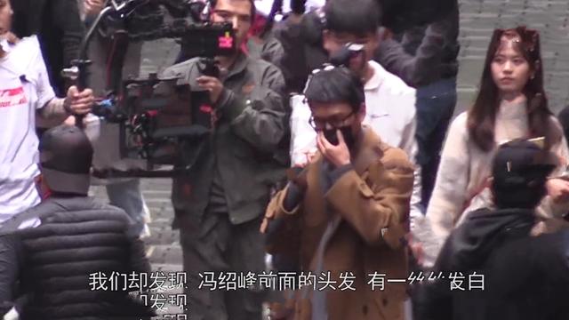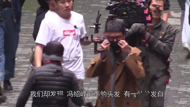 这段戏拍完之后,冯绍峰整理下妆容往回走。而在整理妆容的时候,我们发现,冯绍峰额头上的头发有一小撮白,同时戴着老款眼镜,而面容则是比较暗黄发暗,这明显是上了年纪的装扮。
