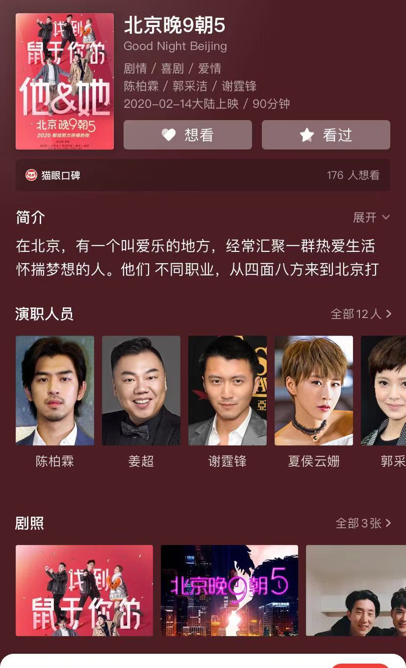 猫眼显示《北京晚9早5》鼠年情人节上映,房祖名的名字还是没有出现,距离上映一个月多,难道一点也不宣传吗?