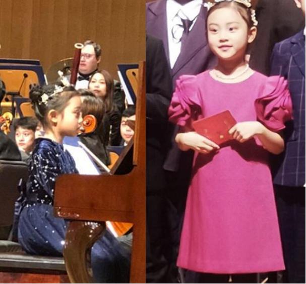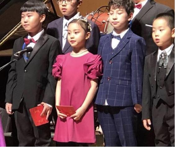 当天的活动中,网友还晒出了甜馨的另外两套造型。一套是深蓝色星空纱裙,甜馨同样坐在钢琴前,淡定且专注地认真弹着钢琴,还有一套是玫红色的小礼服,小小年纪一点儿都不怯场。