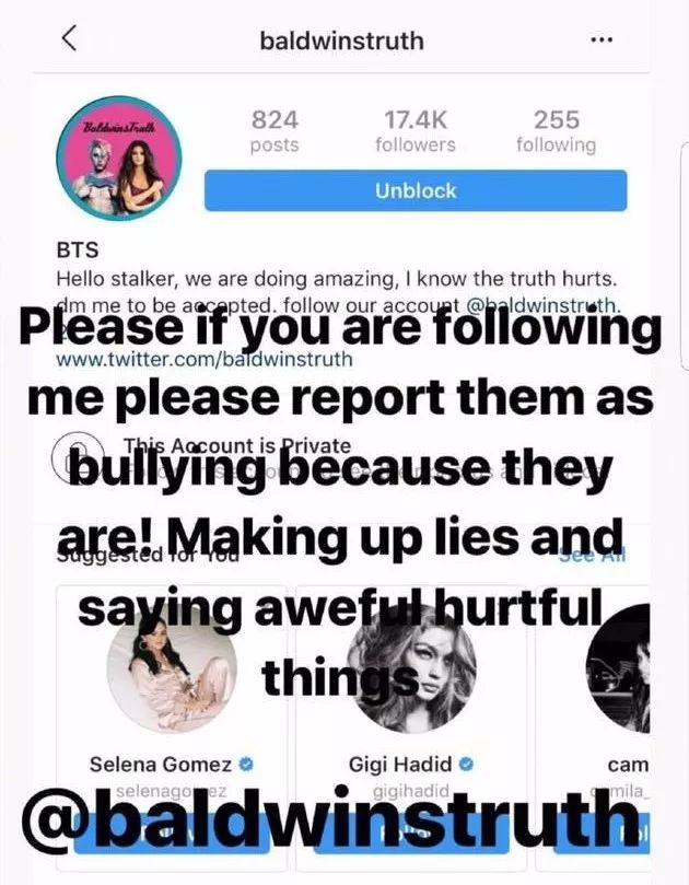 4月份继续跟比伯赛琳娜的CP粉们扯来扯去,甚至把CP粉的ins主页截图,并配文“如果你在关注我,请举报他们,因为他们在编造散播谎言,还说一些伤人并令人伤心的话。”