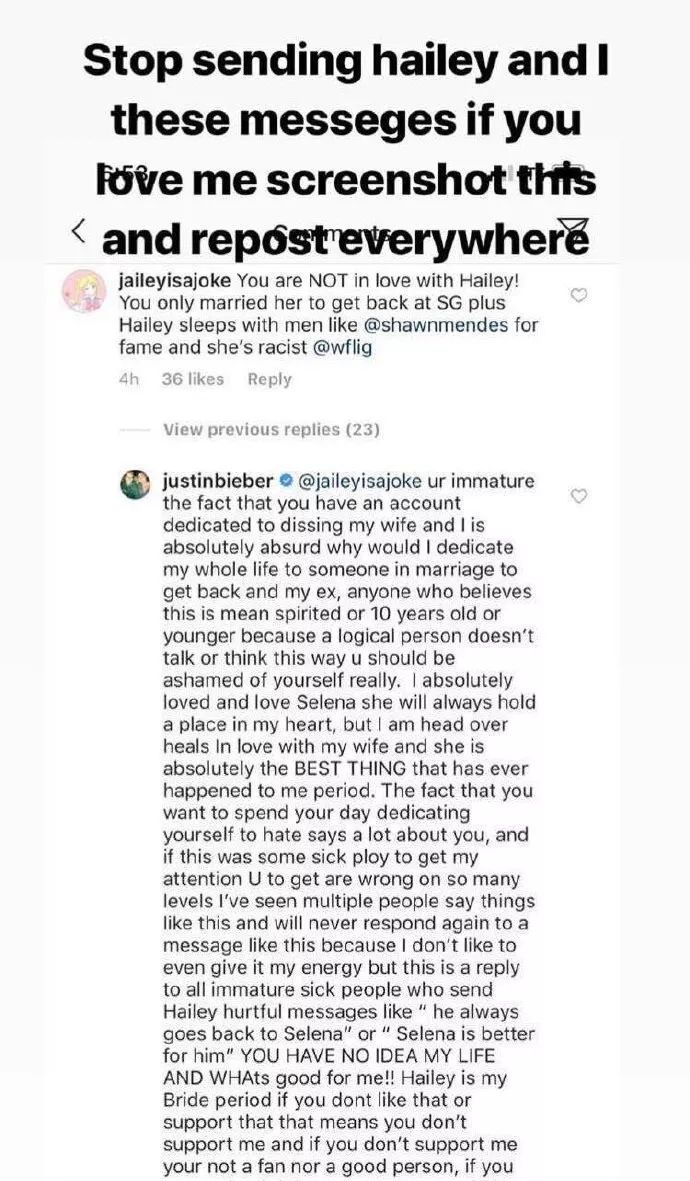 比伯看见这条评论非常认真的写了一长段话,大概是网友评论的几倍长,讲述自己的确爱过赛琳娜,但我现在深爱我的妻子,我能遇到她绝对是最好事。