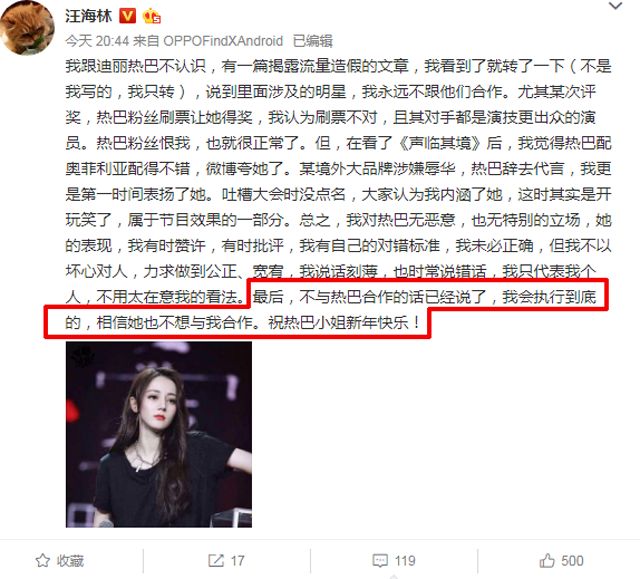此外,汪海林还继续表示:“最后,不与热巴合作的话已经说了,我会执行到底的,相信她也不想与我合作。祝热巴小姐新年快乐!”这样的汪海林,似乎还是一码归一码的。