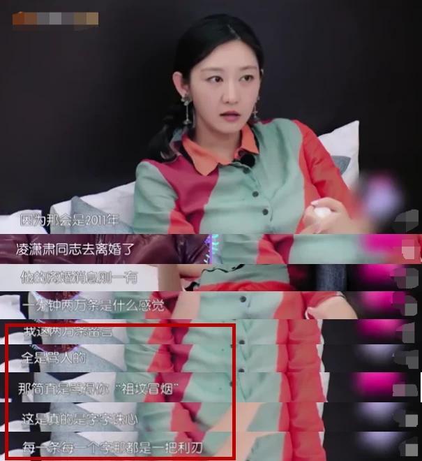 唐一菲表示自己可能需要用一生的时间来消化,那是因为2011年的时候凌潇肃的离婚消息曝光了,然后一分钟之内自己的微博评论区就只见骂人的回复了。而且字字诛心,每一个字都在骂人。