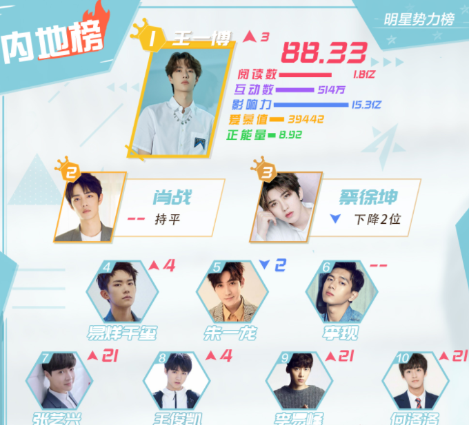 王一博肖战夺明星势力榜冠亚军,张艺兴和李易峰飙升至前十名