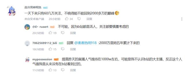 可以说,冯提莫的B站首秀还是相当成功的,礼物、弹幕都是停不下来。一晚首秀之后,这数据就成为了网友们最为关注的,礼物、弹幕、人气什么的,都是相当给力,不过在关注上面,黑粉们开始带节奏了,看到这仅60万的关注,甚至是带起了B站亏了的节奏。