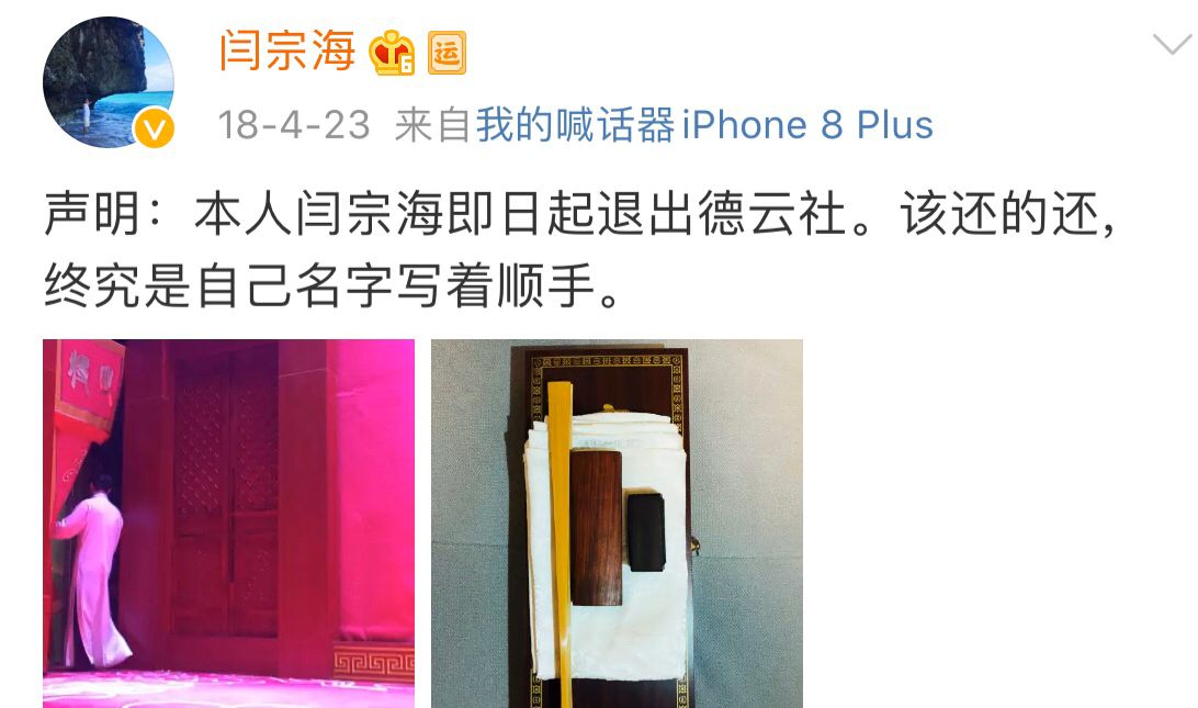 2018年4月23日,闫云达突然在微博上发了一条声明:本人闫宗海即日起退出德云社。该还的还,终究是自己名字写着顺手。