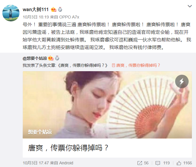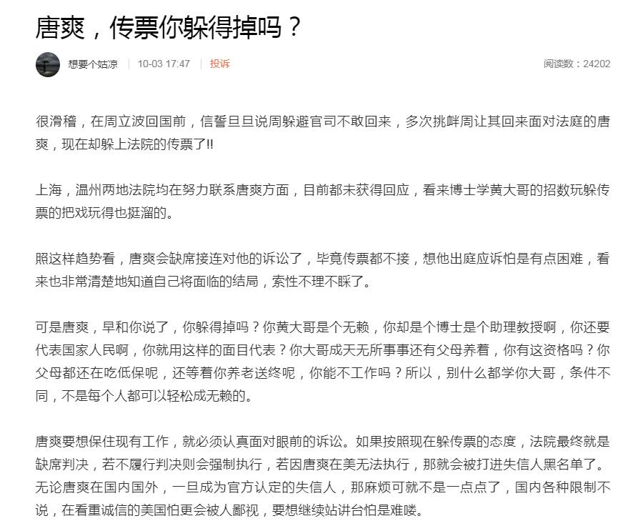 当然,也不排除,是周立波的粉丝故意谎称唐爽躲传票,以此来攻击唐爽。